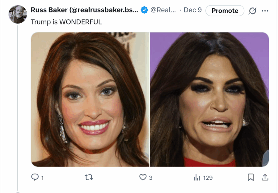 A few days ago, I tried posting a funny meme I’d seen circulating. It showed MAGA star Kimberly Guilfoyle, Donald Trump Jr.’s ex, in a before-and-after photo suggesting horrifically bad plastic surgery, with my added joke about “Before and after MAGA.”