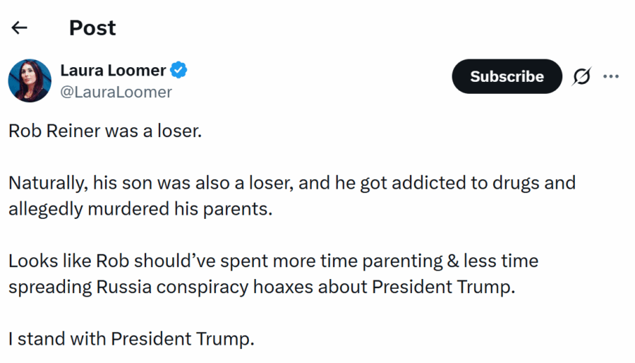 And, on the topic of Elon Musk and his “algorithms,” which I wrote about last week, this week they shoved to the top of my “notifications” Laura Loomer calling the murdered Rob Reiner a “loser” and basically blaming him for his own death. (In fine MAGA influencer style, Loomer appended a fake posting, ostensibly from Reiner’s account, with a “Fuck all of you MAGA…” quote — which we have chosen, as a matter of taste and respect, not to reprint in full.)