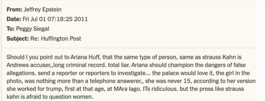 Epstein asked the well-connected publicist Peggy Siegal to reach out to Arianna Huffington, founder and editor of the then-influential Huffington Post, and encourage her team to investigate Giuffre.