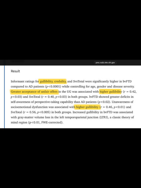 Perhaps the most alarming symptom of dementia, whether FTD or Alzheimer’s, is that it makes the patient far more suggestible, and vulnerable to malign influence. Scientifically, according to a 2025 study, dementia makes people more gullible.