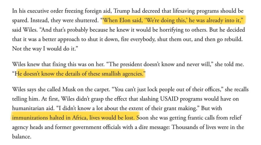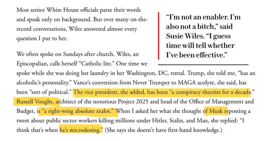 The recently published Vanity Fair interview of Susie Wiles is emblematic of both Trump’s decline and how the coterie of sycophants he’s brought around him take advantage of it. His own chief of staff recognizes, at nearly every turn, the recklessness of his policies — such as allowing Elon Musk to decimate USAID to fulfill his racist agenda — and nevertheless does nothing.