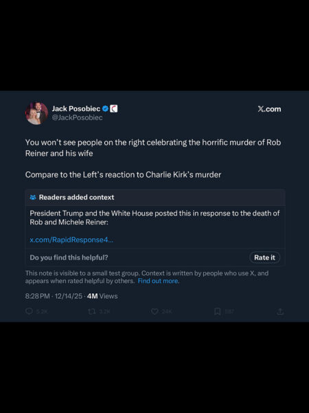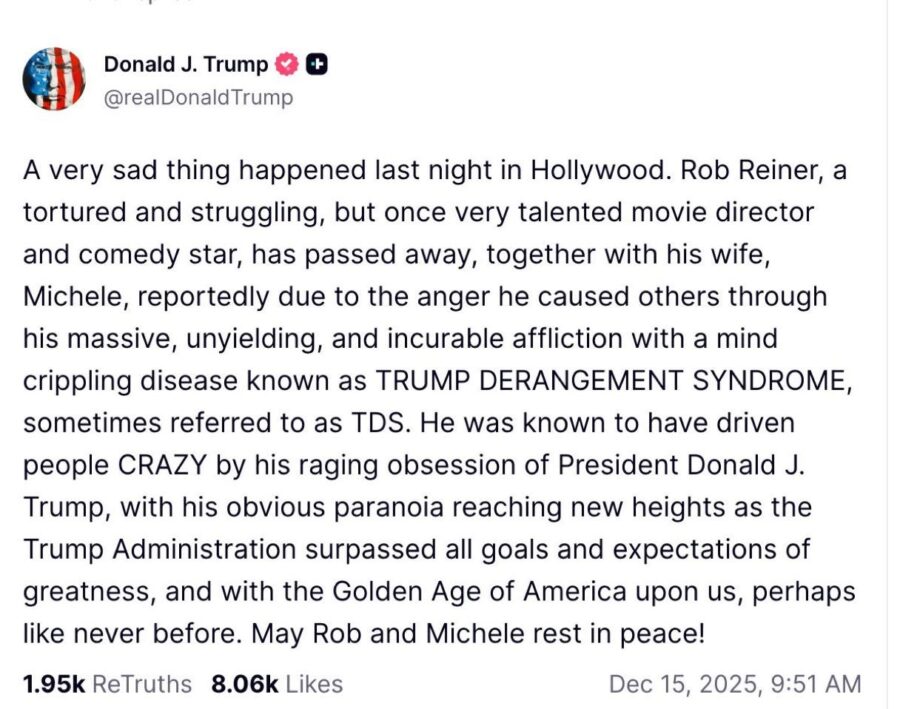 REPORTER: Mr. President, a number of Republicans have denounced your statement on Truth Social after the murder of Rob Reiner. Do you stand by that post?
